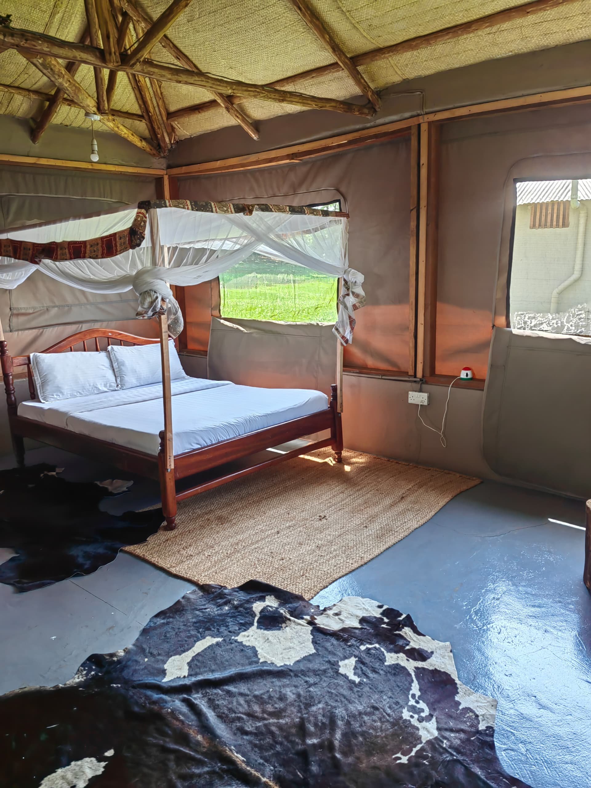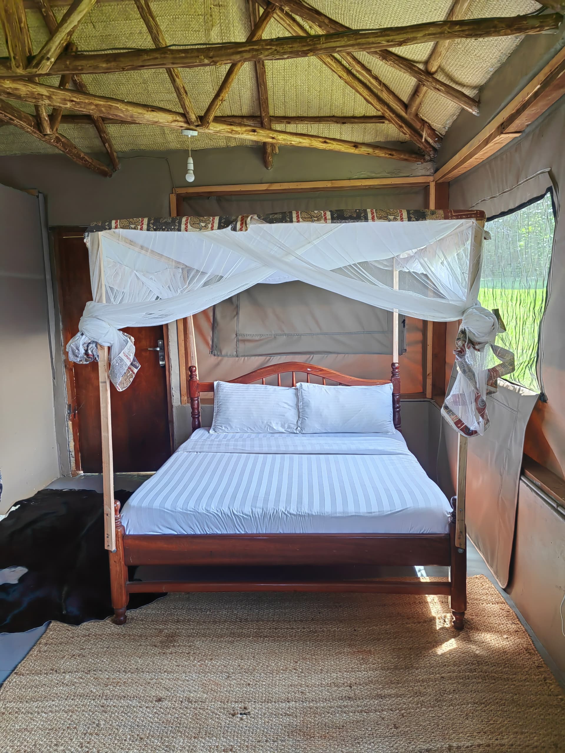 As you step into our glamping tent, you are enveloped in the scent of fresh linens and the earthy notes of the surrounding wilderness. The tent has a cozy single bed with an en-suite bathroom as well as a private wooden deck overlooking the river Nile!